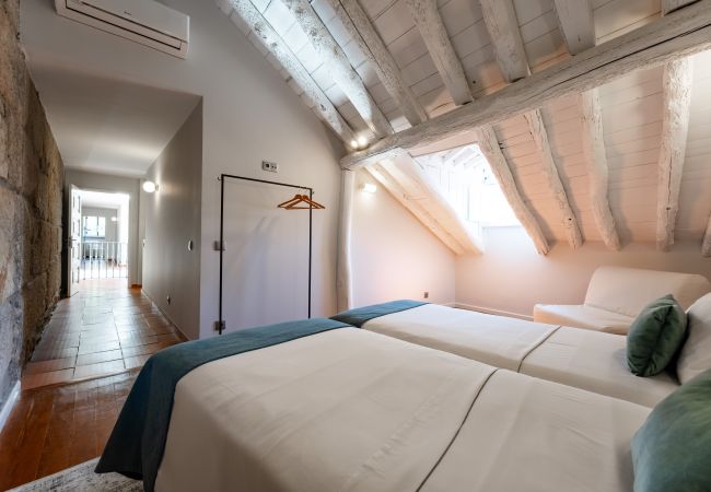 In the Ribeira district one block from the busy riverfront - however, you'd never know high up in this relatively quiet massive two-story apartment. Rooms & bathrooms are spacious and well appointed. All rooms with A/C and heat. The staircase in thever mais