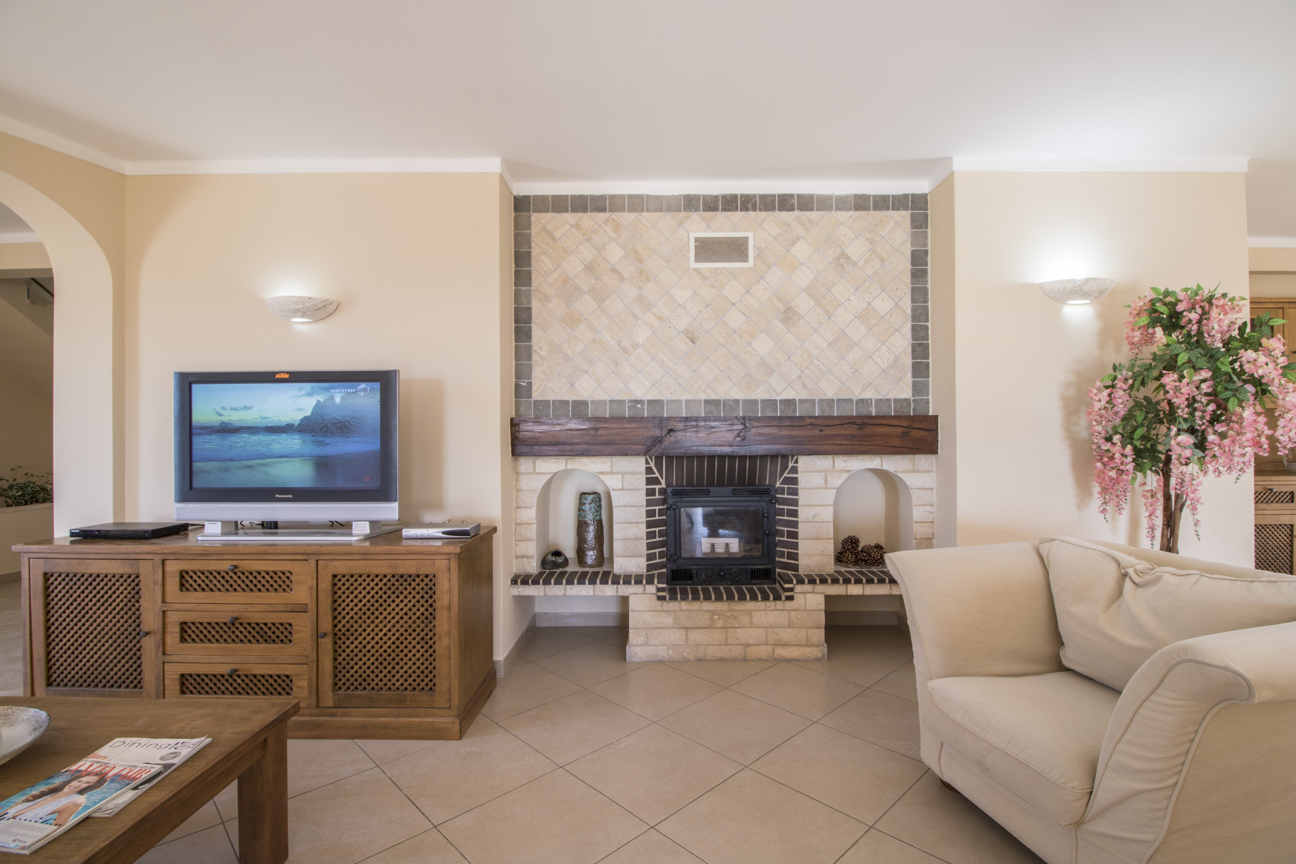 The fully equipped kitchen makes mealtimes simple, with dishwasher, washing machine, microwave, coffee maker and all essential kitchenware. Just outside, a charcoal BBQ and outdoor dining area invite relaxed al fresco meals with a view. The large living room combines lounge and dining spaces and features a fireplace for cooler evenings, Wi‑Fi, TV with UK channels (such as BBC and ITV), and a pool table for laid-back entertainment at home.
