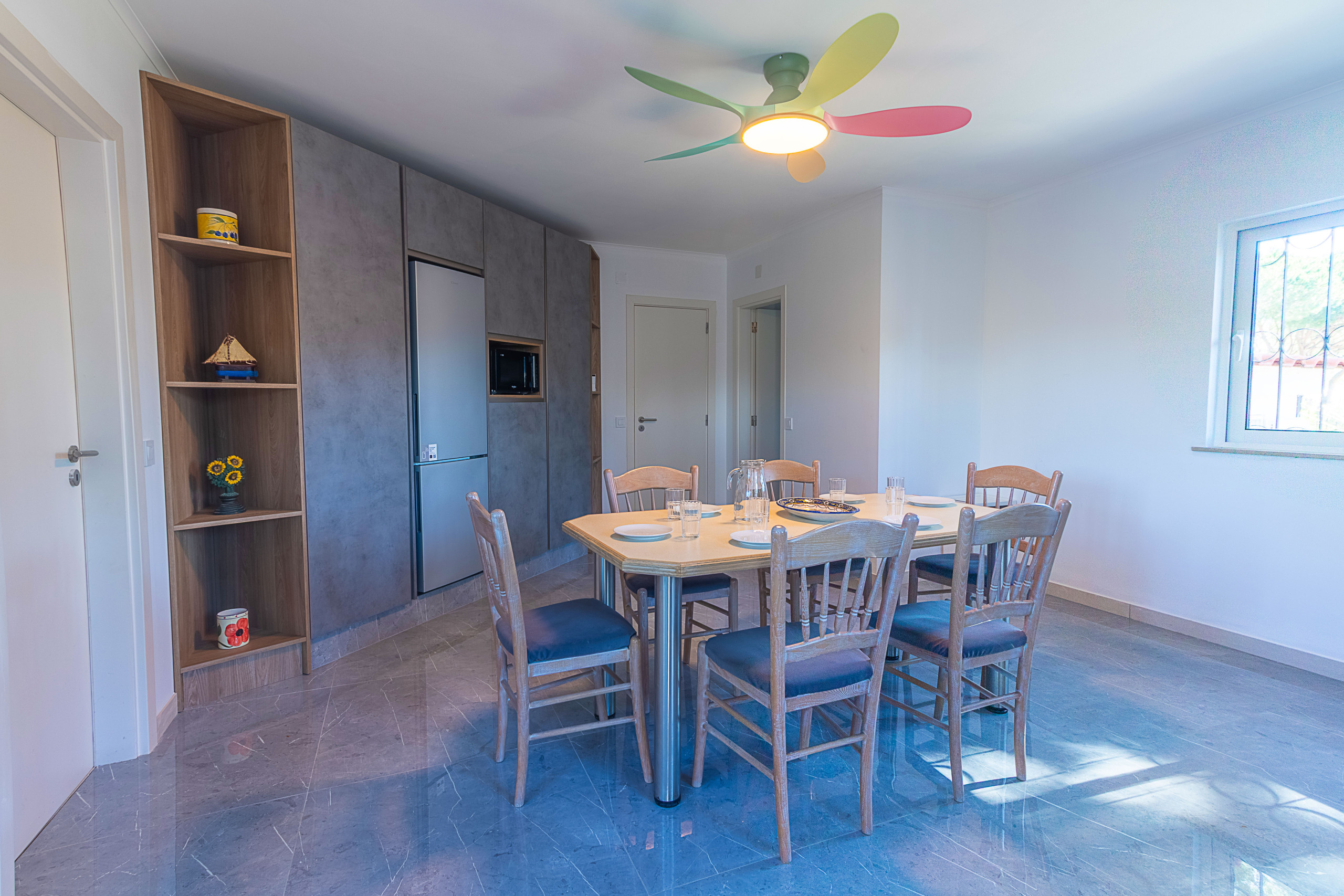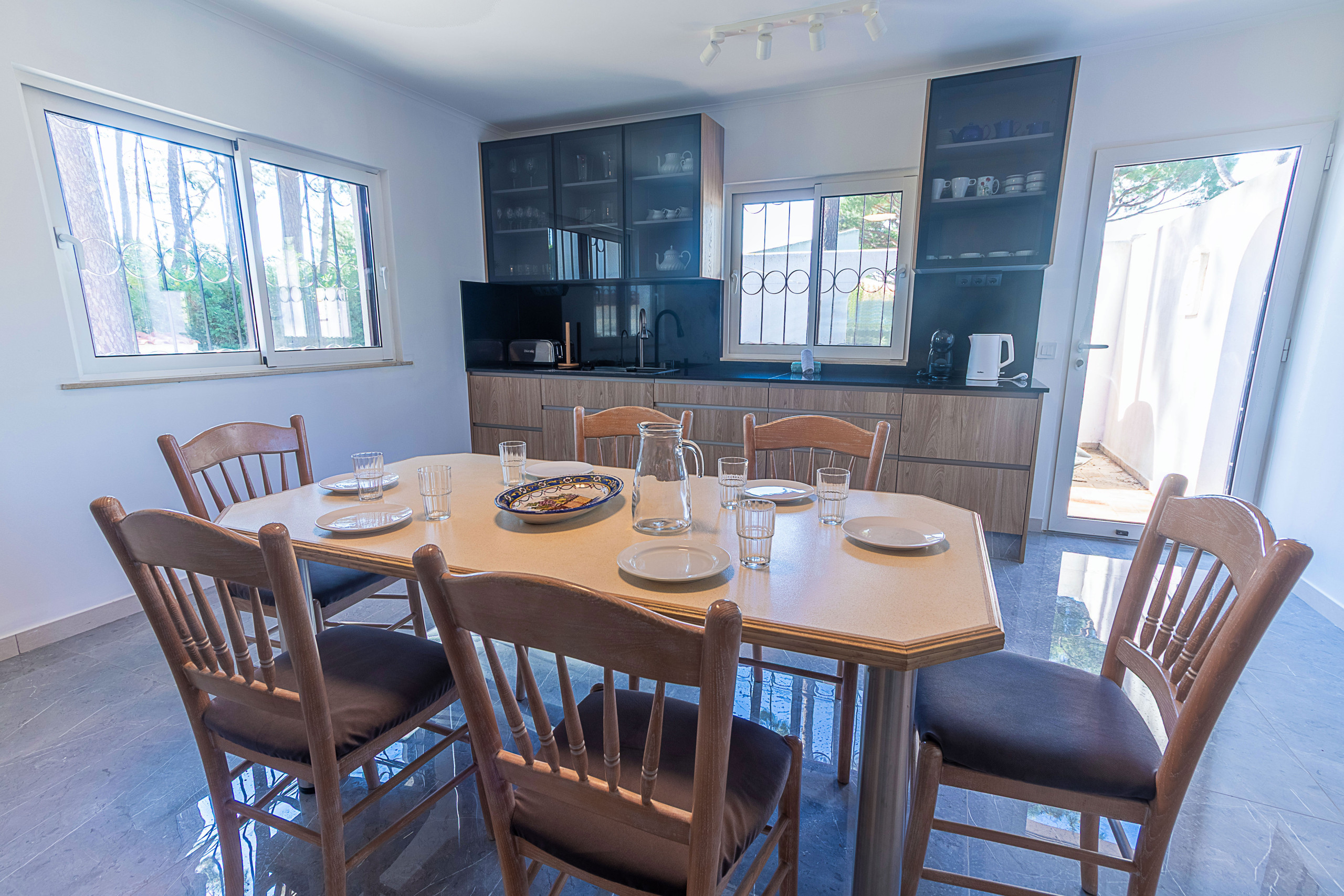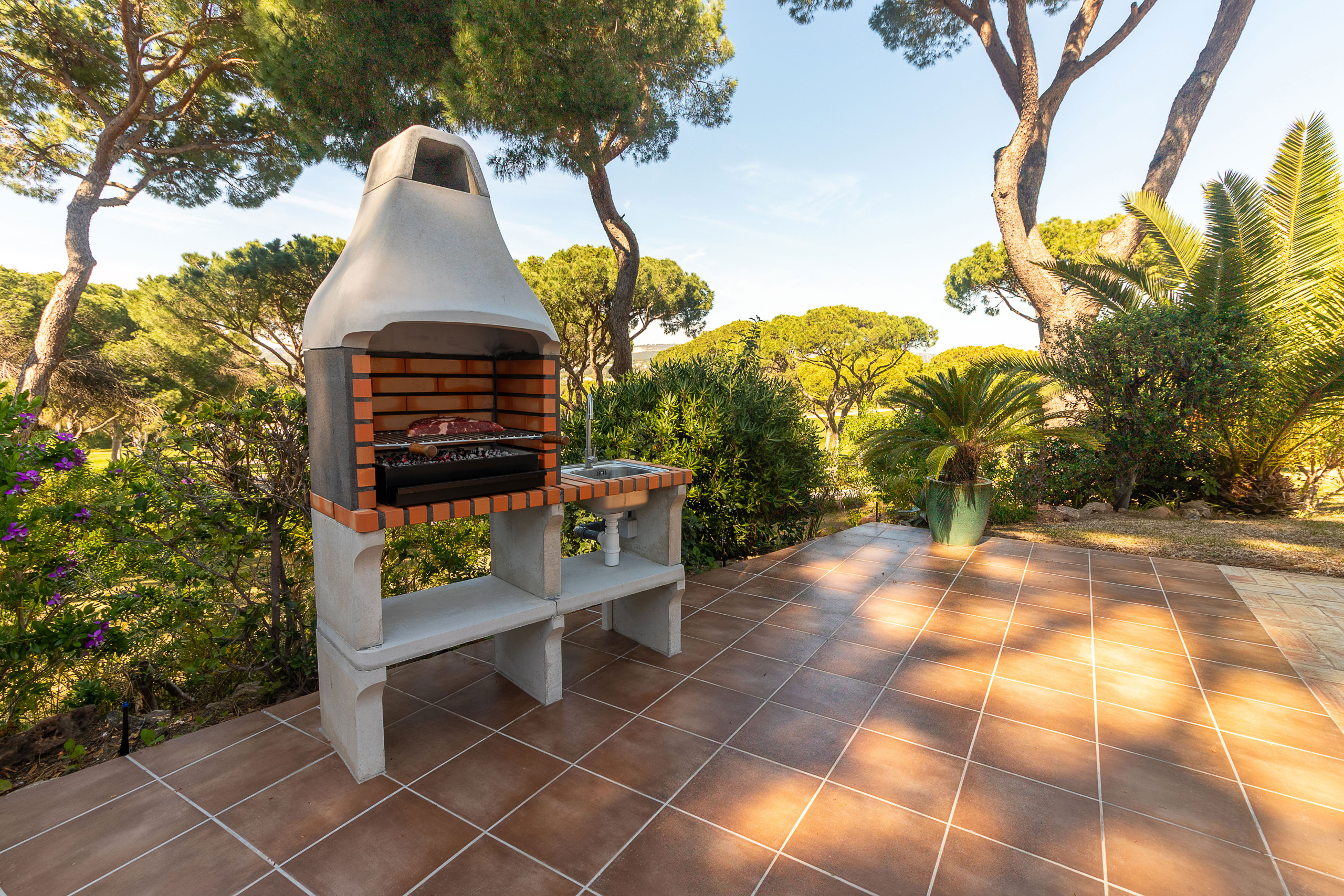 The fully equipped kitchen has dishwasher, microwave, coffee machine and essentials for easy family meals. The spacious living room with Wi-Fi broadband, TV (Portuguese/foreign channels) opens directly to the shaded outdoor dining pergola.